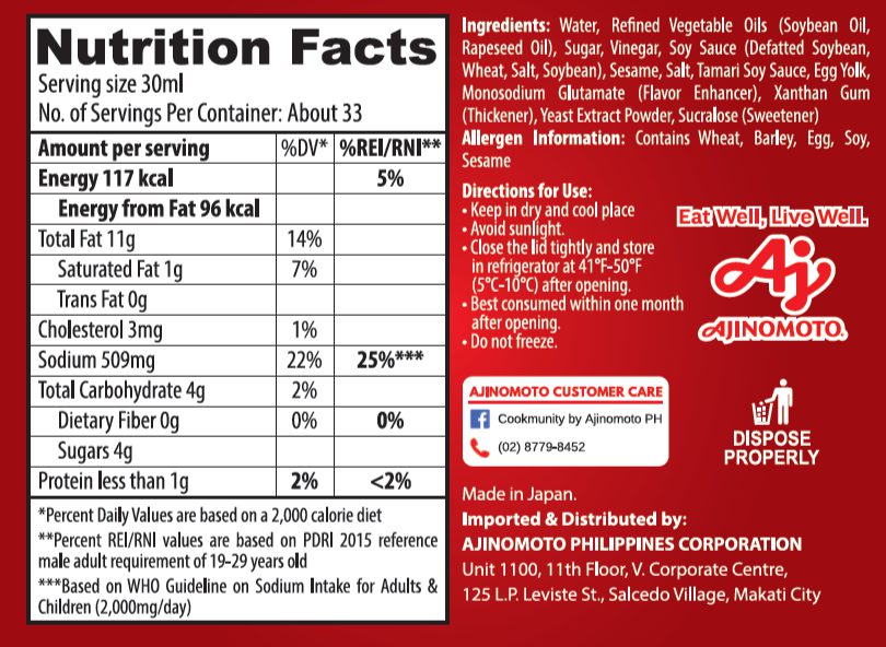 Water, Refined Vegetable Oils (Soybean Oil, Rapeseed Oil), Sugar, Vinegar, Soy Sauce (Defatted Soybean, Wheat, Salt, Soybean), Sesame, Salt, Tamari Soy Sauce, Egg Yolk, Monosodium Glutamate (Flavor Enhancer), Xanthan Gum (Thickener), Yeast Extract Powder, Sucralose (Sweetener)
